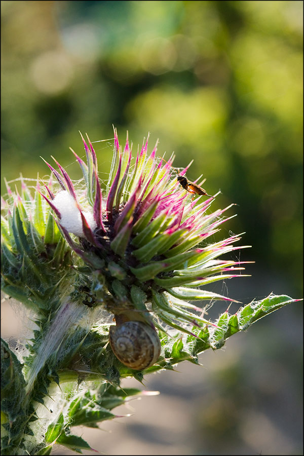Diptère et escargot sur chardon penché